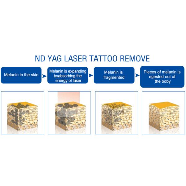 ND YAG technology -- Adopting the Q-Switched ND:YAG model,the equipment uses laser to emit high energy instantaneously which smashing the pigment of pathological tissues,namely the laser leading explosive effect:High energy emits instantaneously,making particular wavelength laser penetrating epidermis and getting into pathological pigment tissues in only 6nms.Then pigments expand in top speed and explode.The superficial epidermis would be bounded out of body;other part of the pigments would split into granules which would be engulfed by macrophages,then exclude by the lymphatic system finally.The pigment becomes shallow gradually finally disappear while the surrounding normal skin tissues keep sound as they do not absorb particular wavelength laser.